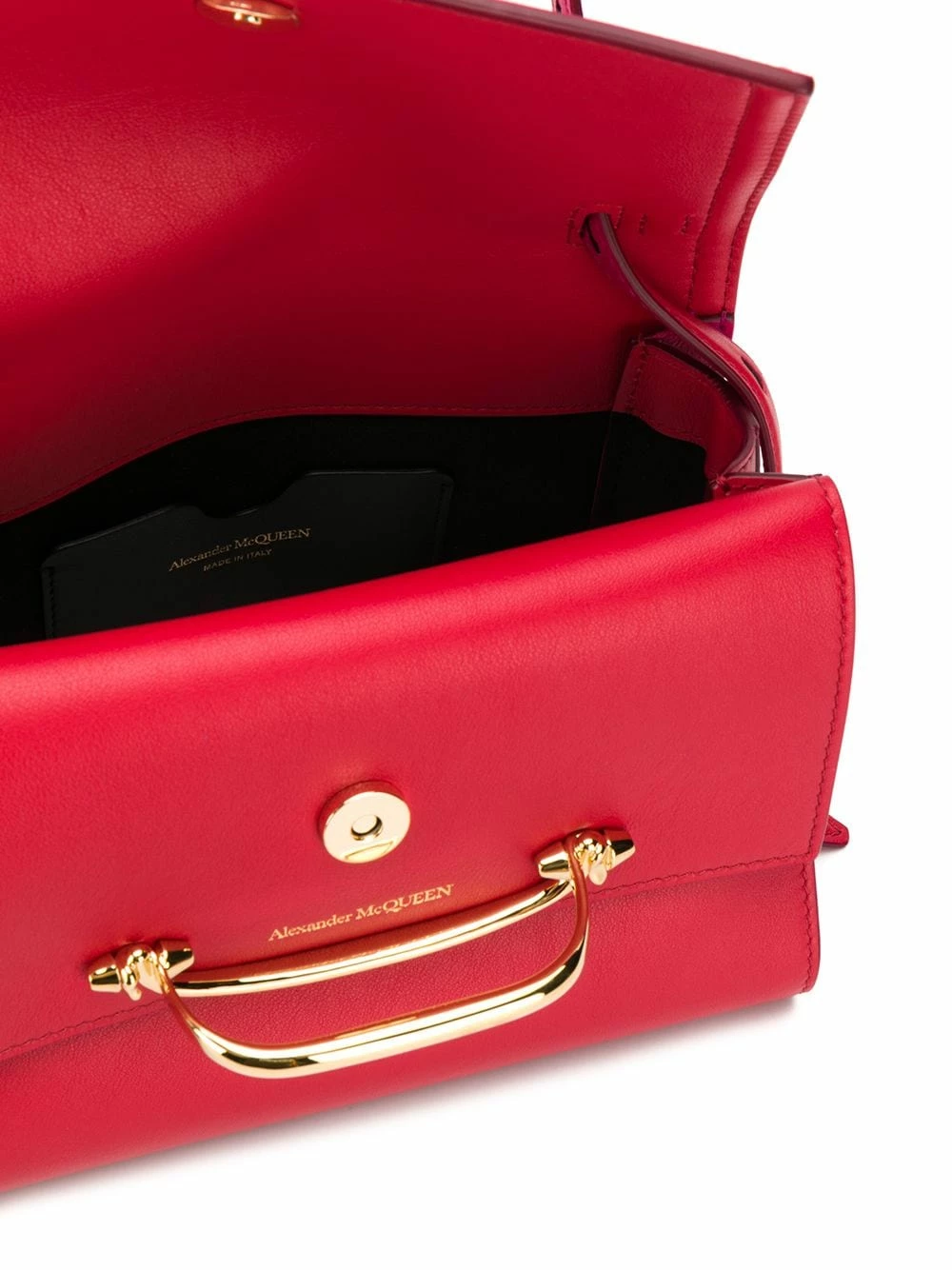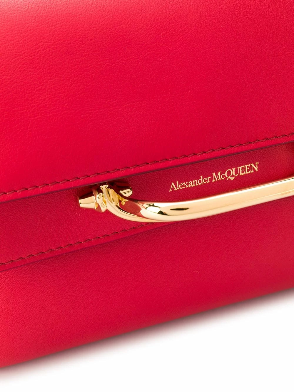 Double the trouble. When you see this red leather small double flap bag from Alexander McQueen, red warning flags will flash before your eyes because of the sparkling gold-tone hardware and double-flap front. Don’t see red, simply fall in love. Featuring a round top handle, a foldover top, a magnetic fastening and gold-tone hardware.