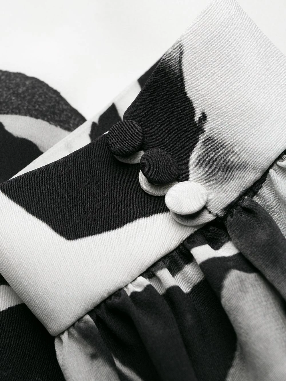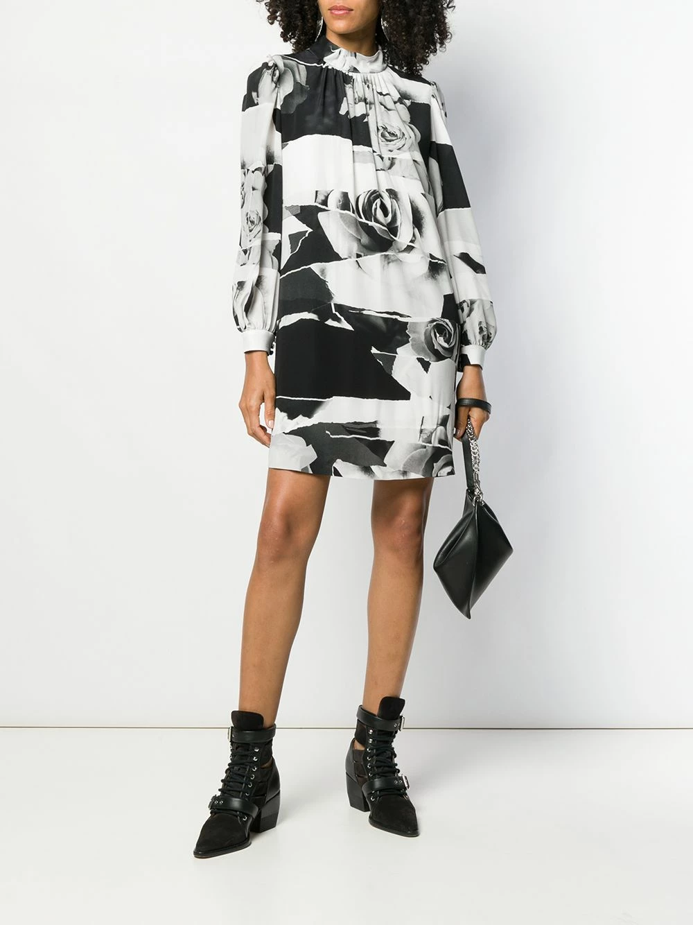 Alexander McQueen replaces gothic, dark romanticism for classic feminine designs in the new collection, as showcased by this black and white silk Torn Rose print dress. Featuring a stand up collar, a back button fastening, long sleeves, a shift silhouette and a short length.