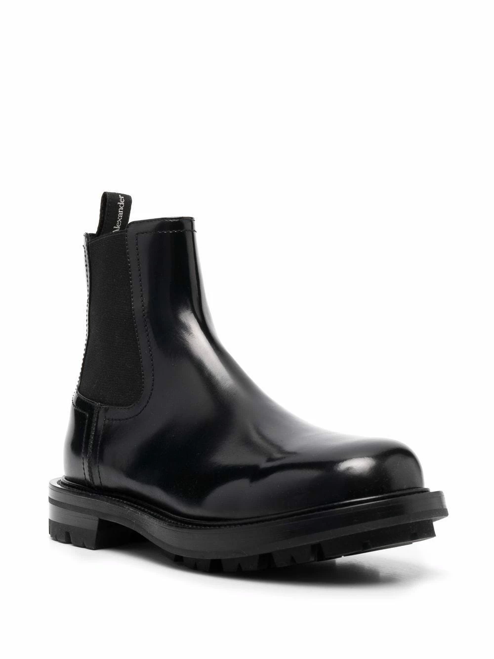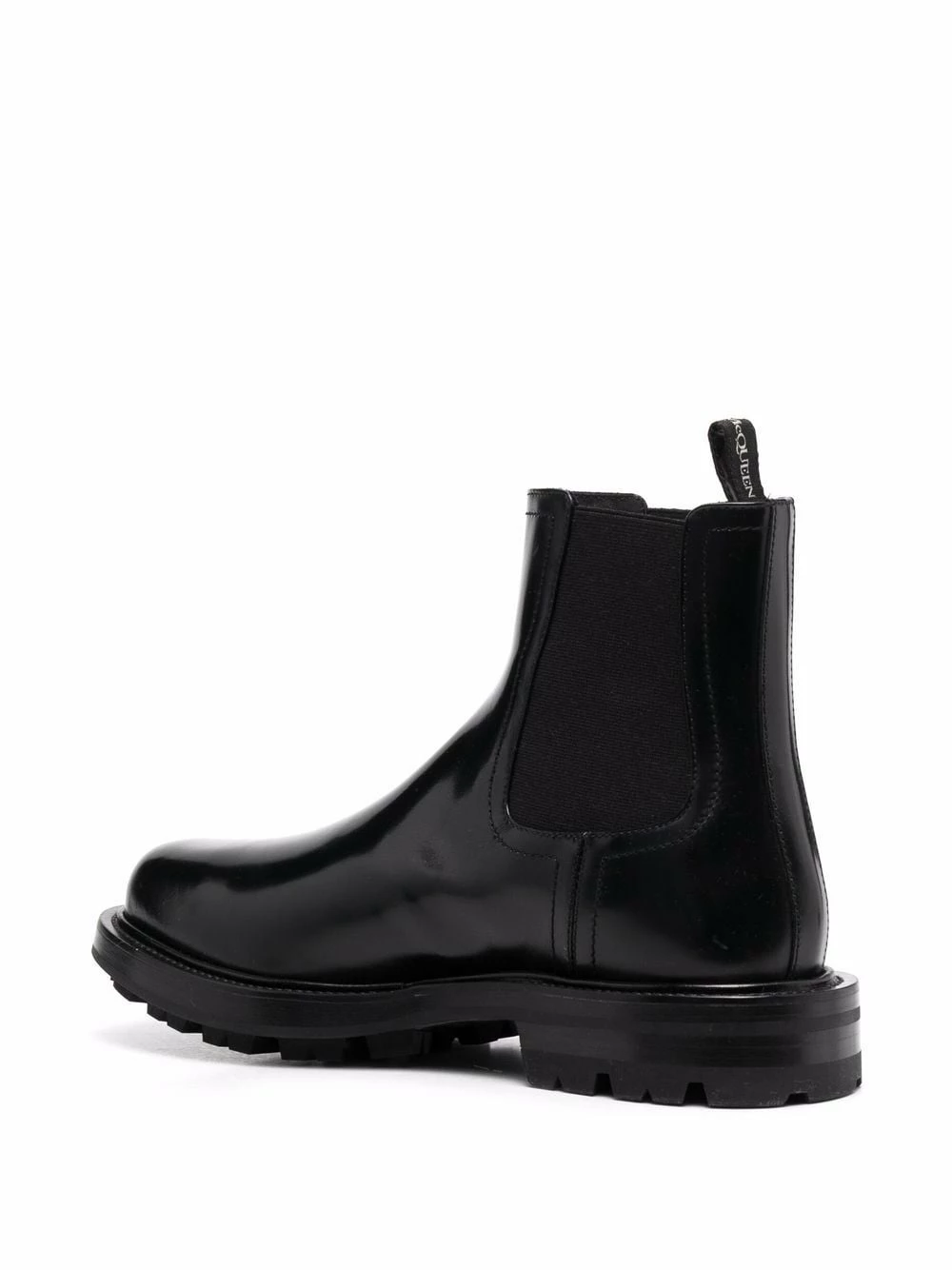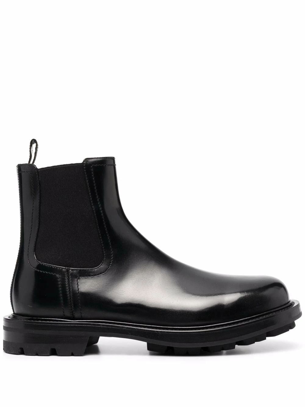 Designed in a classic Chelsea silhouette, these ankle boots from Alexander McQueen boast a timeless appeal. This pair has been crafted in Italy from glossy black calf leather.