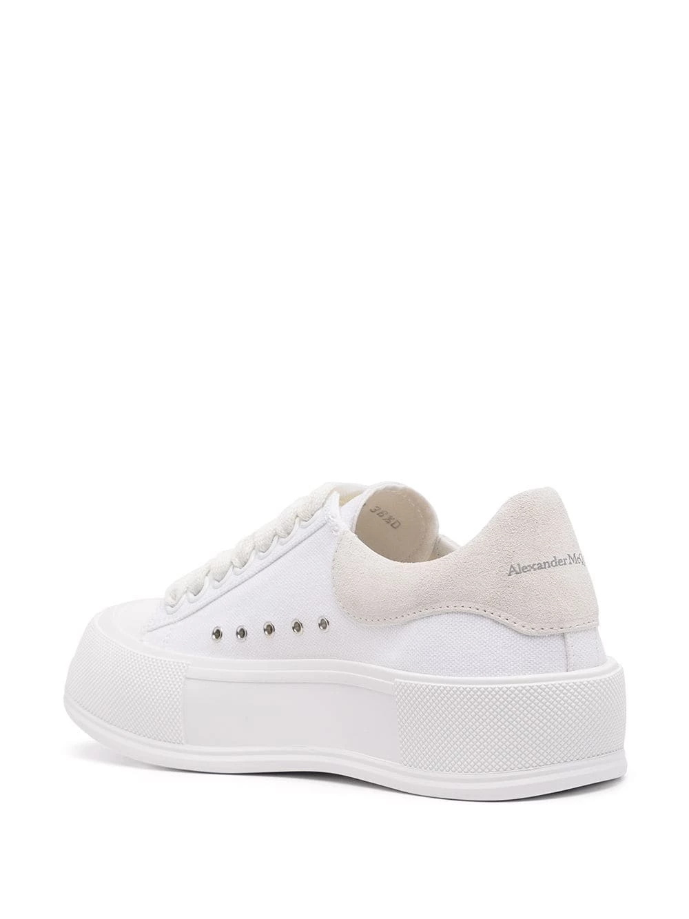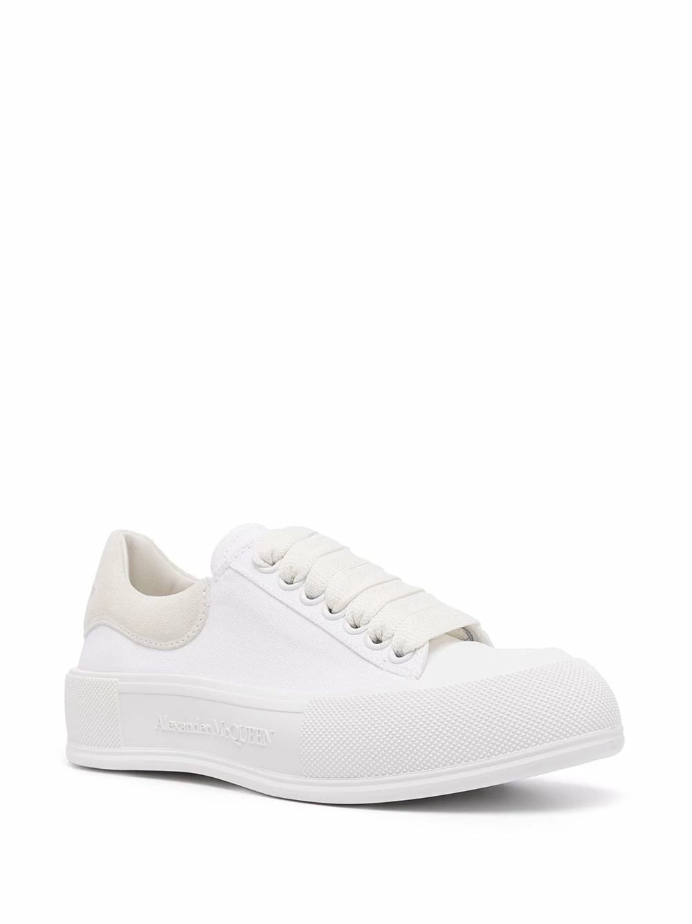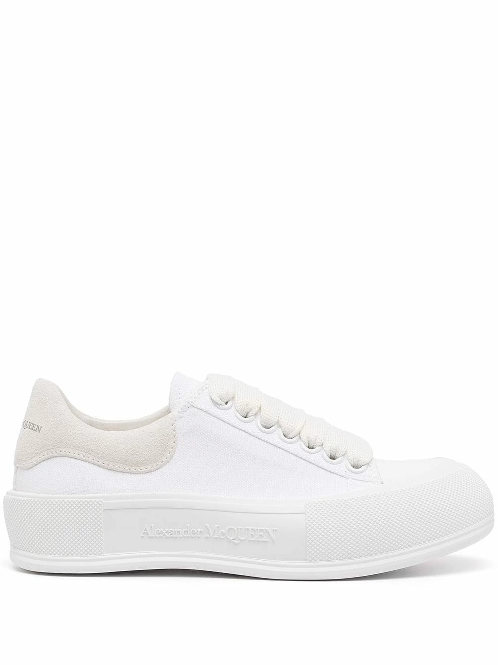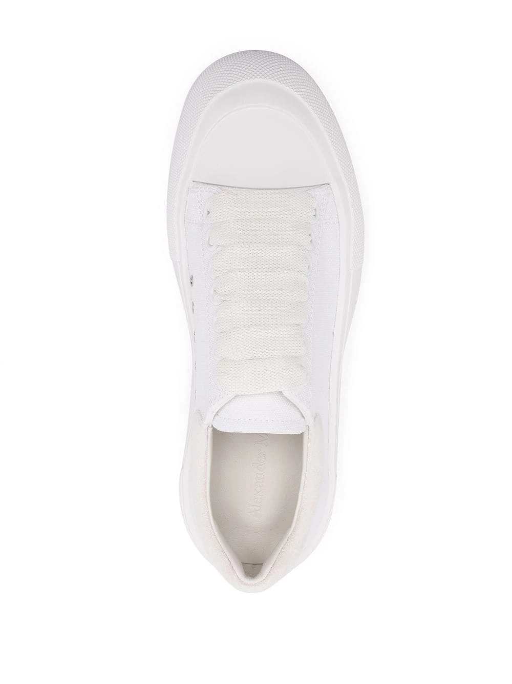 Known for creating distinctive silhouettes through technical construction, this approach is applied to these Alexander Mcqueen sneakers. The front lace-up fastening, silver-tone hardware eyelets and rubber sole become exaggerated details which in a white palette remain refined.Â