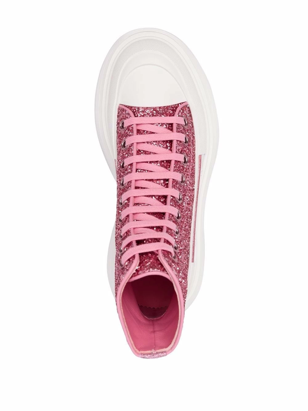 Since its debut in 2019, Alexander McQueen’s Tread Slick style has been updated in various guises. These pink glittered ankle boots offset the chunky rubber sole that’s characteristic of the design.