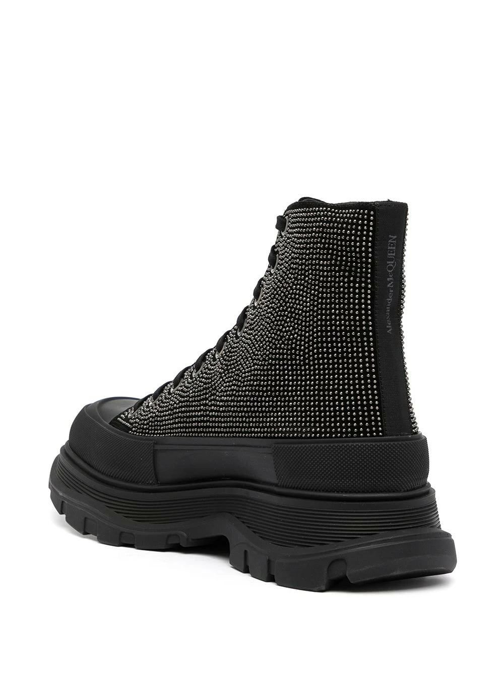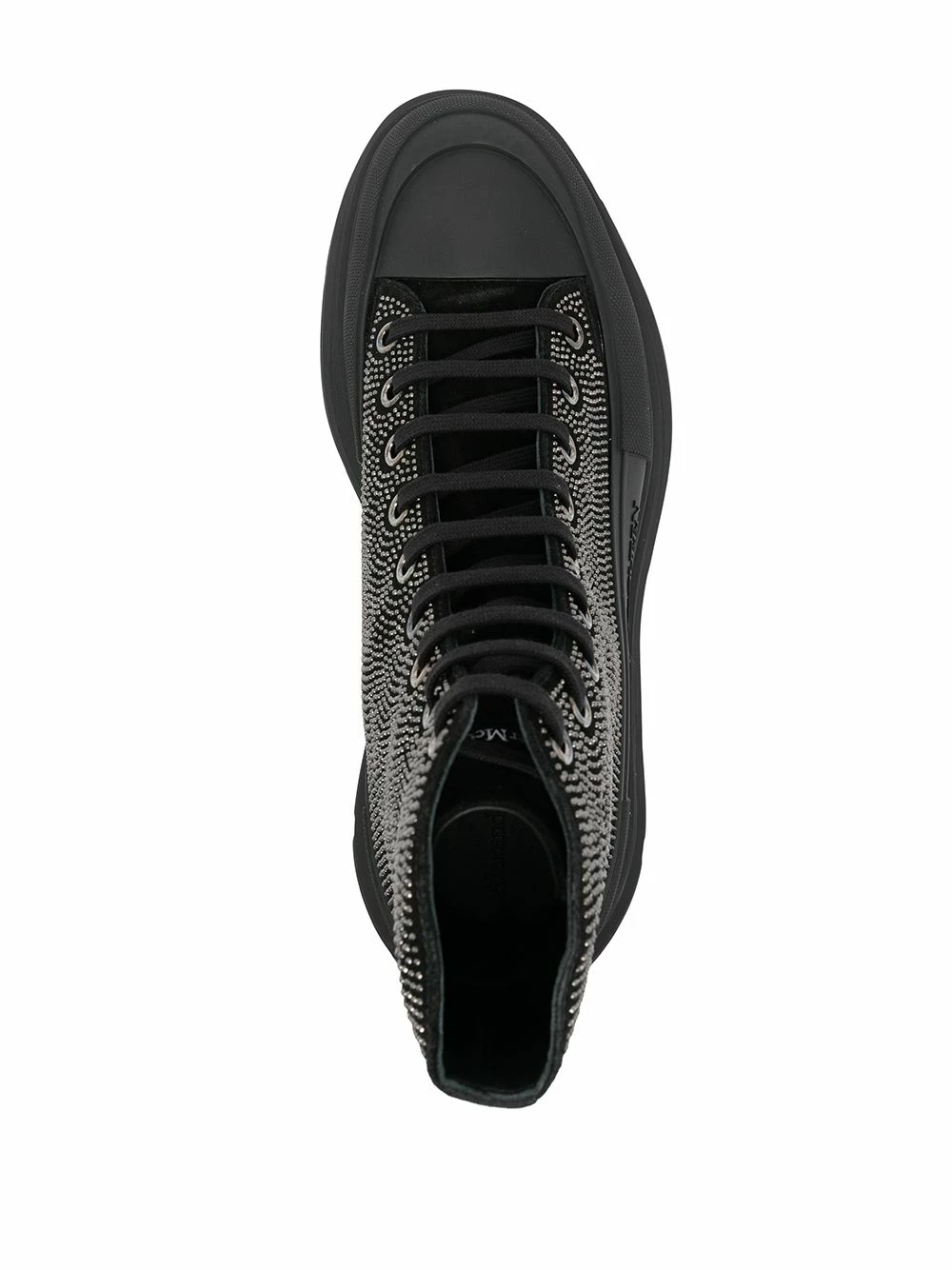 For AW21, Alexander McQueen presents a new iteration of the Tread Slick high-top sneakers. Defined by the iconic oversized rubber sole, this iteration comes embellished with miniature silver-tone studs.