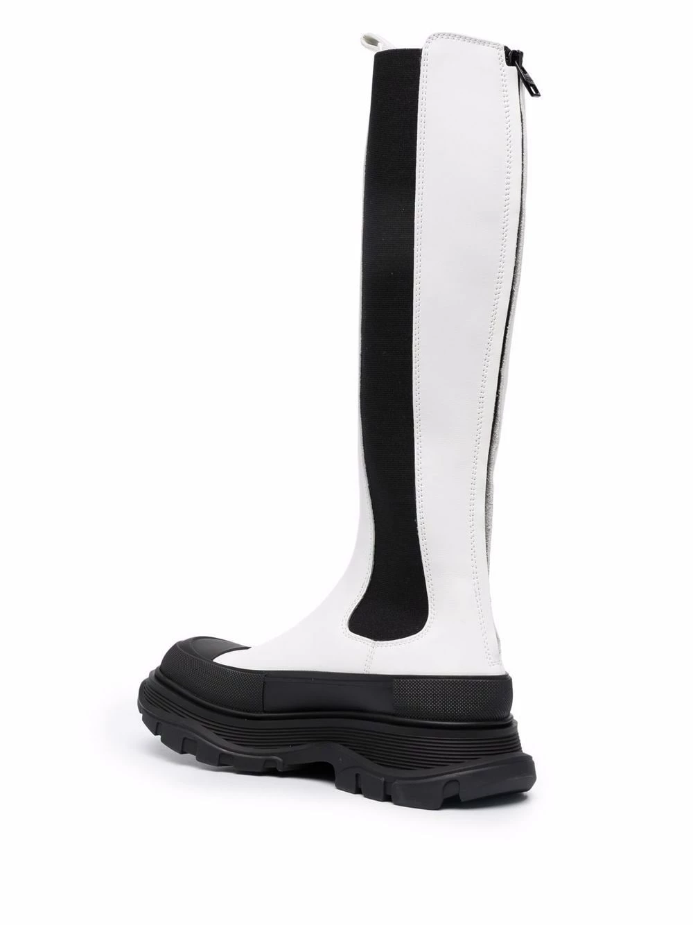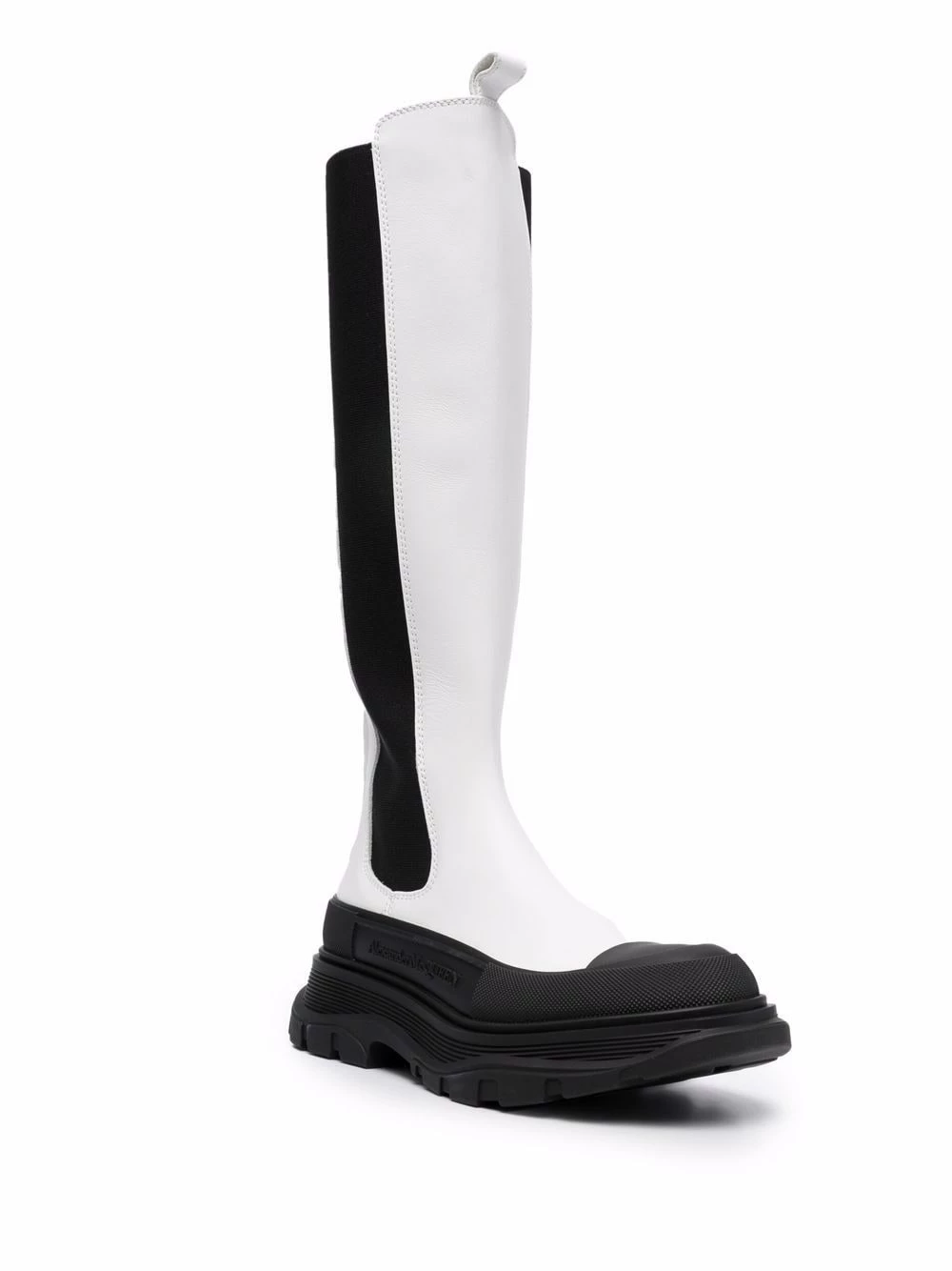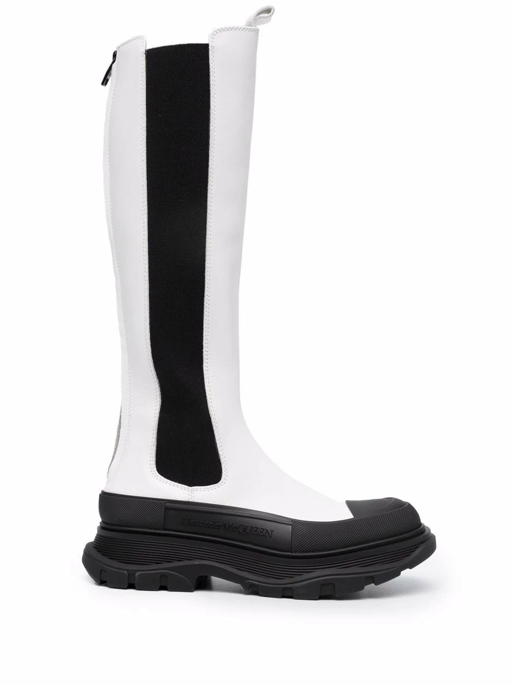 Alexander McQueen’s Tread Slick boots borrow design elements from utilitarian styles. Free from decoration, this two-tone design is defined by the chunky rubber soles that temper the fitted silhouette the elasticated panels offer.