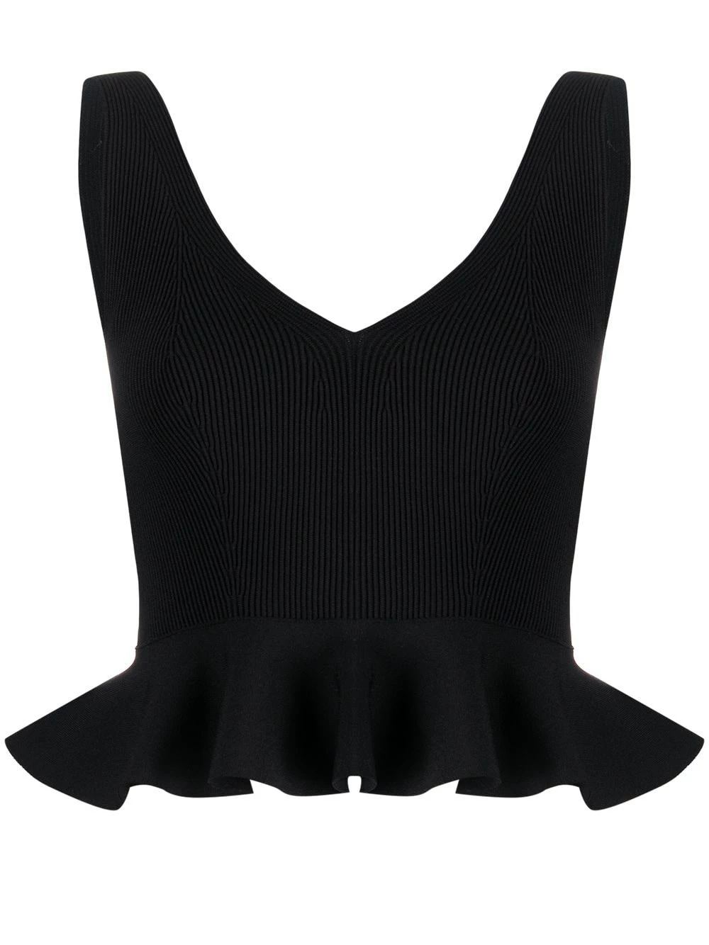 Put some pep in your step, with a peplum hem. In a ribbed knit construction, this top from Alexander McQueen boasts a jet black hue and a peplum silhouette that gives the piece a sense of the dark luxury for which the brand is known. Find the light in the dark.Â