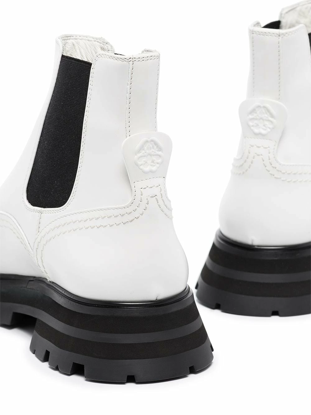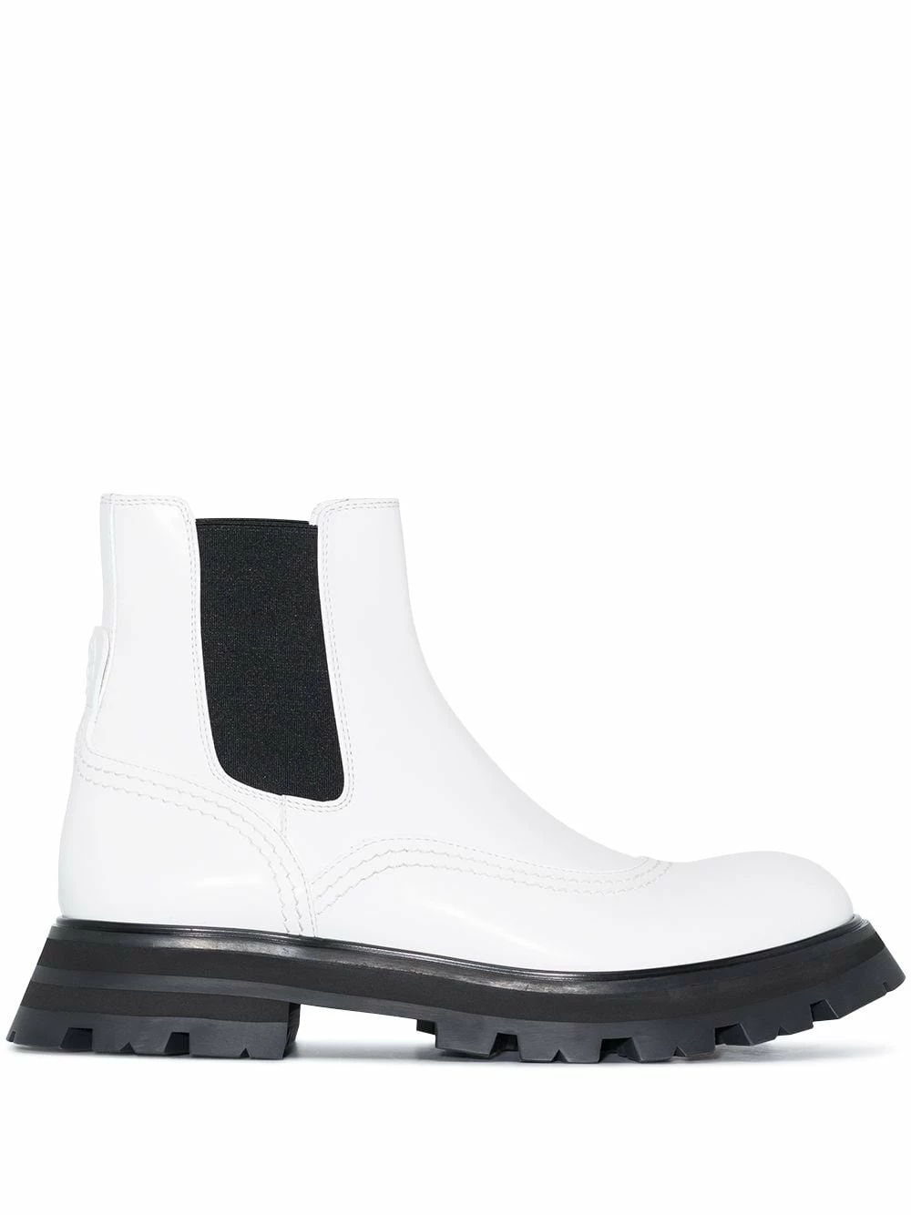 Alexander McQueen sets these white Chelsea boots on lug midsoles with a stacked effect, highlighting their chunky proportion. Italian crafted from leather with a round toe, this pair fits with elasticated side panels and feature the brand’s Tudor-rose logo at the heel tab.