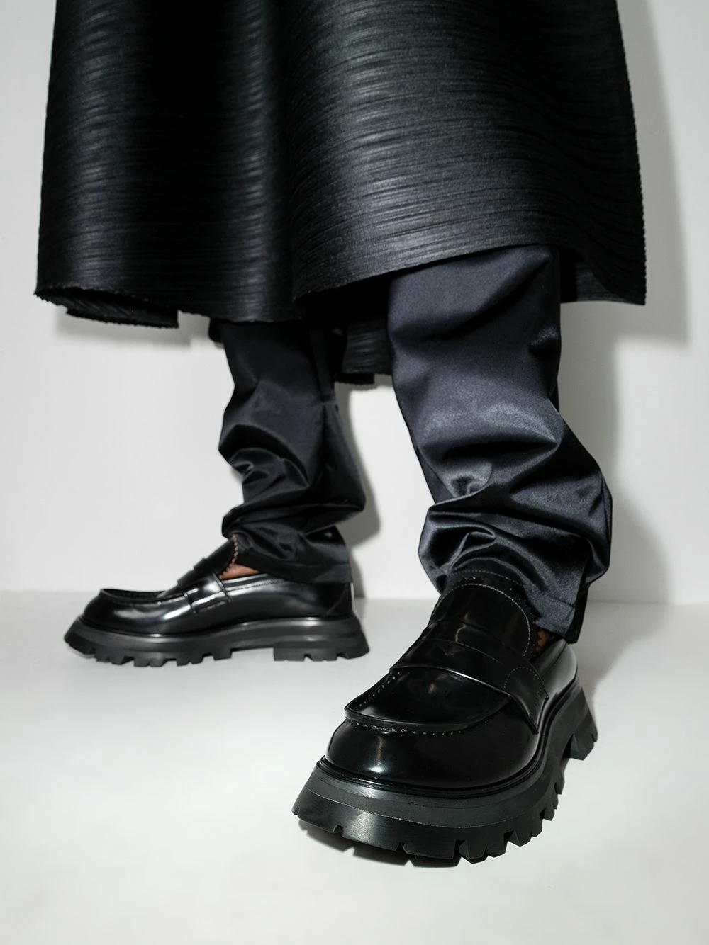 Alexander McQueen’s rebellious attitudes are translated through these black Wander loafers, set on an exaggerated lug rubber sole. They’re Italian-crafted from polished leather and feature a pinked tongue and a penny slot, then finished with a flared heel stitch to confer the classic moccasin silhouette with a contemporary feel.