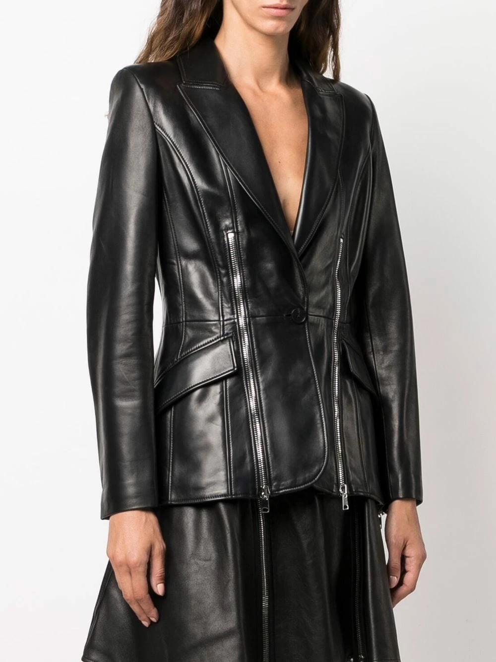 Presented in a black colourway, this Alexander McQueen jacket showcases the label’s punk attitude. Crafted from lambskin and calf leather, this fitted piece is distinguished by the multiple decorative two-way zip detailing.